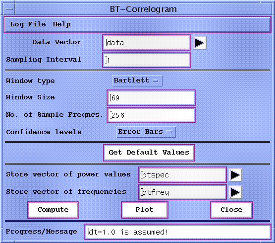 Once a data vector has been read in using the File/Data pull-down menu, selecting `B-T Correlogram' from the Analysis Tools menu launches the tool window. Figure 2a shows its state after pressing the Get Default Values button, see below: