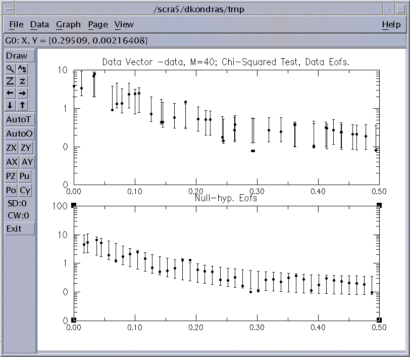 The results of both the 'Data Eofs' and 'Null-hyp. Eofs' bases on the above plot indicate significantly elevated variance in EOFS 8 and 9, which form the pair at close to the same frequency as the weak oscillatory signal in our dataset.