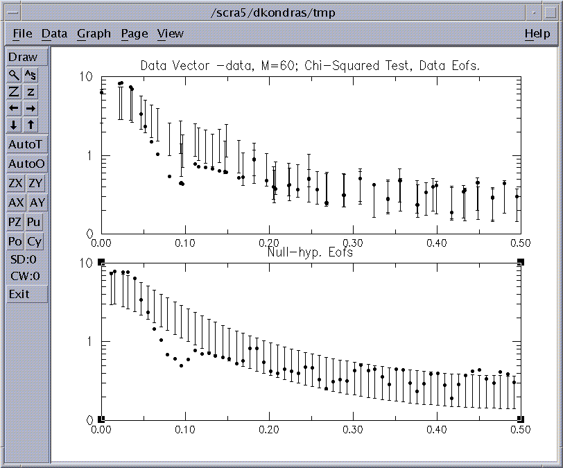 Accordingly, to test against a pure red-noise null-hypothesis, we choose Chi-Squared as a significance test in the Test Options panel, leaving the Include EOFS field blank, as in Fig.12. After clicking the Compute and Plot buttons, the following graphics window will open: