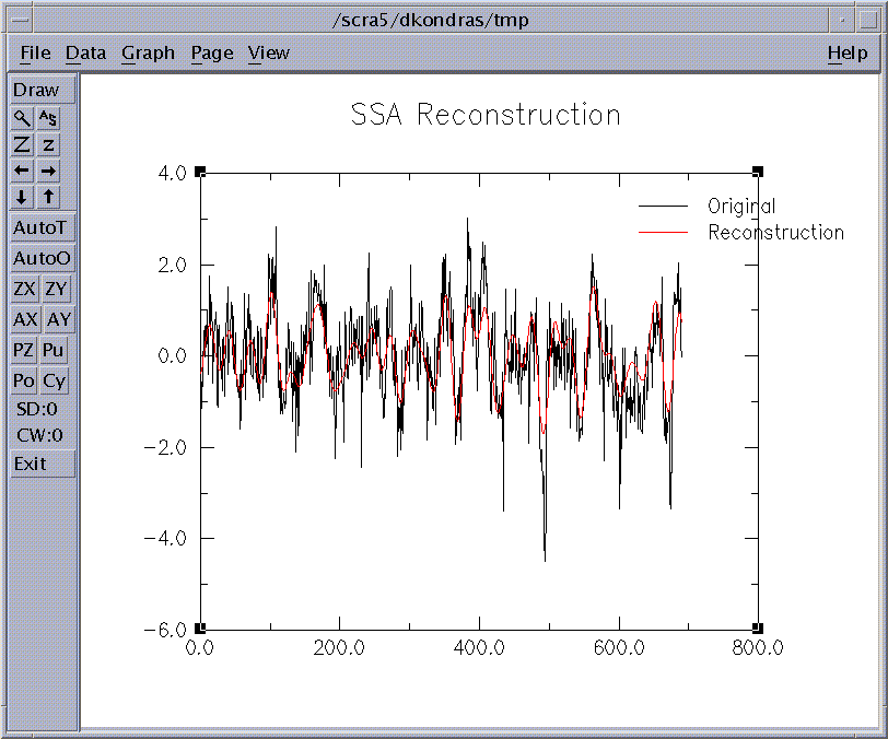 Here the reconstructed signal is plotted against original timeseries, with a mean average removed. If this SSA-filtered RC series ('ssarcvec' vector) is now analyzed by MEM or MTM, the frequency spectrum of the RCs is much simpler than that of the complete time series, since most of the "noise" has been removed (Penland et al. 1991, Keppenne and Ghil 1992). The