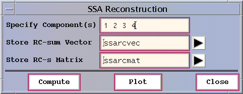 The Reconstruction pull-down menu on the main SSA panel allows the reconstruction of the original timeseries from selected SSA components, specified as a space-delimited set of integers: