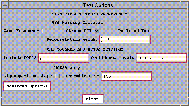 Advanced Options: This button yields a control panel that allows the MCSSA "Data Basis", "Noise Basis" and the set of surrogates to be saved to a file, or read (NB: read function not yet implemented - sorry!) in from one. This may be useful if you want to use a custom-made basis, or you want to save a large ensemble of surrogates for future use. The red-noise coefficients used to generate the surrogates can also be overidden by inputting values here. Warning: If these files are not in the correct format, the Toolkit will crash!