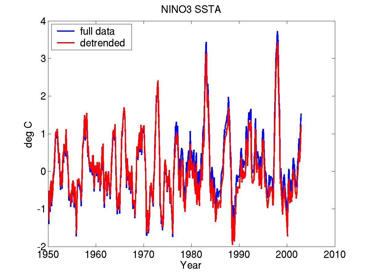 Figure 1. Time series of the observed NINO-3 SSTA from January 1950 to December 2002 and of the same dataset with a low-frequency trend removed.