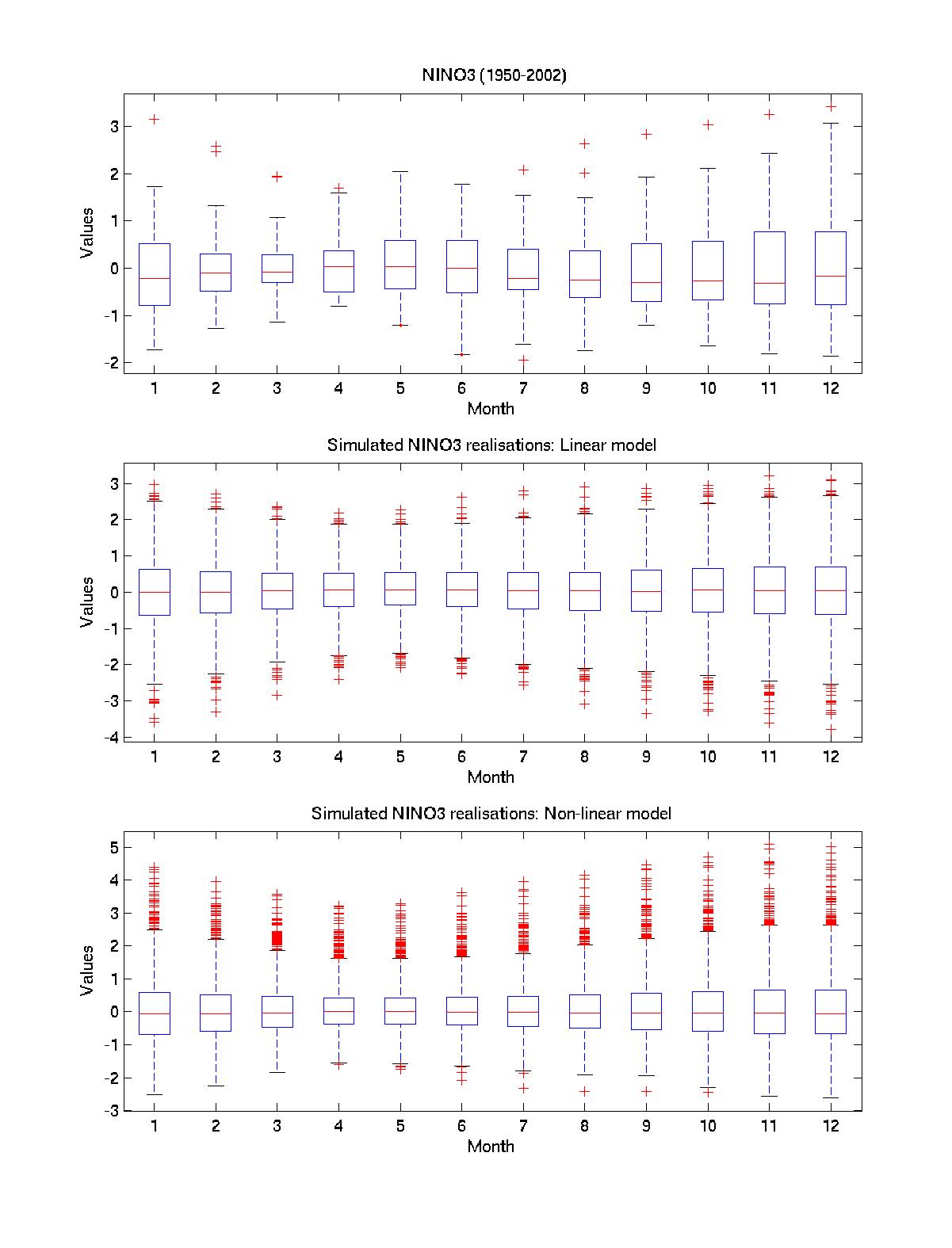 Figure 3a. Boxplots for each month of the observed Nino-3 SSTA (detrended), and of the Nino-3 stochastic ensemble for linear and nonlinear models. Points beyond the whiskers represent outliers of the distribution; both nonlinear model and observed time series exhibit similar non-symmetric positively skewed outliers population, while for linear model it is clearly symmetric. Other observed features captured by a nonlinear model include stronger interannual spread and higher outlier values in winter.