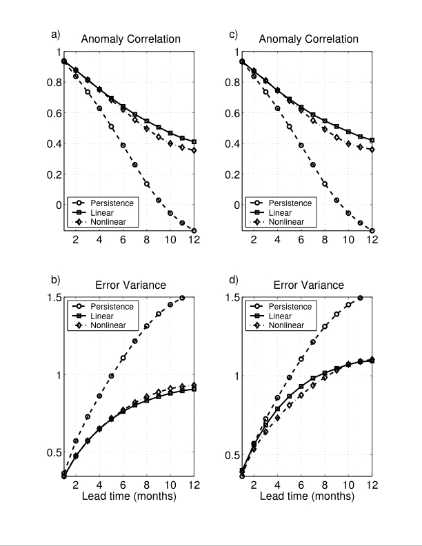 Next we compare 2-L linear and nonlinear models. The anomaly correlation coefficient and normalized prediction error varaince, are shown in Fig.5 for the cross-validated Nino3 SST forecasts: (a) and (b) for the 100-member ensemble mean, (c) and (d) for the extreme event forecast series, which are defined as the weighted sum of the top and bottom 20% of ensemble forecast. Such a time series produced by a quadratic model has a smaller rms error than that of its linear counterpart [panel (d)], with both models' anomaly correlation being essentially the same as for the ensemble mean forecast [compare panels (c) and (a)]. This improvement of the quadratic versus linear forecasts comes from the ability of nonlinear model to capture non-Gaussian PDF distribution characteristic of ENSO, with positive anomalies having larger amplitude than the negative anomalies, while the PDF distribution of the linear inverse model time series is normal. The linear model tends, therefore, to underestimate the magnitude of El Nino events, and, likewise, to overestimate that of La Nina events.