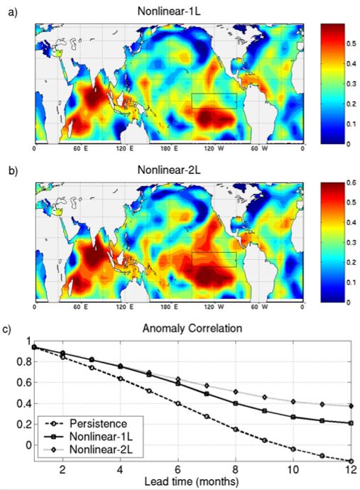 The 1-L and 2-L nonlinear (quadratic) models are compared in terms of their respective forecast skills in Fig.4. Spatial distribution of SST anomaly correlation of 9-month lead forecast for the 1-L and 2-L models is shown in panels (a) and (b), respectively. The forecast time series is a 100 member ensemble mean of models' stochastic realizations, and it has been cross-validated over the whole time series as described above.