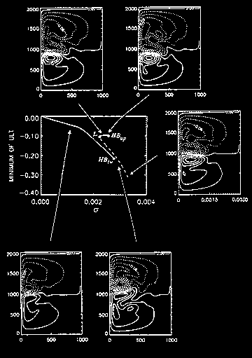 As shown in the bifurcation diagram (center) of a reduced-gravity, shallow-water model, its behavior can change, even for fixed wind stress, depending on the system's parameter values. Single and multiple equilibria, purely and quasi-periodical oscillations, and chaotically varying flow occur as the stress on the system increases or the constraints on its motion decrease. The variability has dominant peaks at subannual and interannual time scales; the exact periods of these peaks depend, in turn, on basin size. Other panels in the figure are snapshots of the model's upper-layer thickness for various parameter values (from Speich et al., 1995).