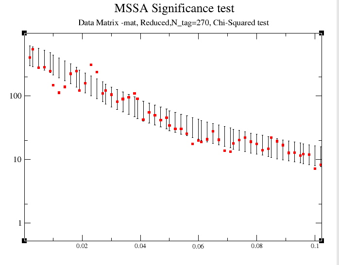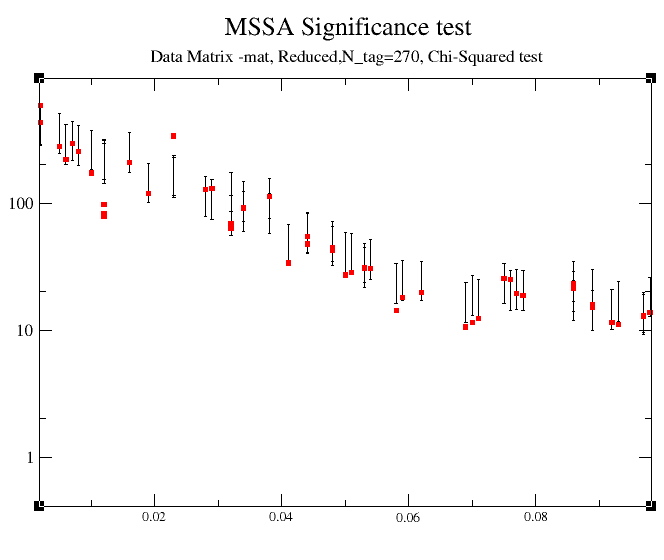 The dominant frequencies of MSSA modes are computed only in Monte-Carlo or apporximate, but much faster Chi-squared MSSA test. Choosing Chi-squared in the Significance tests menu, and M=N'=270 we obtain the following plot: