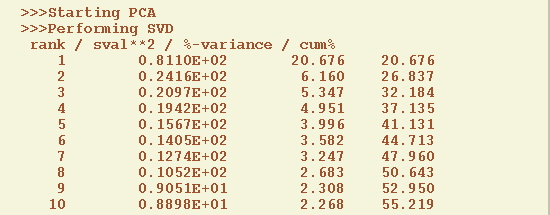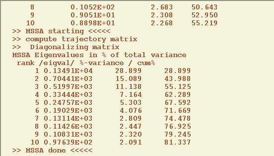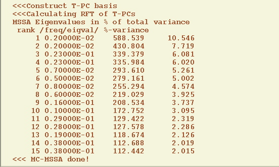 This favors the association of larger decorrelation times with larger spatial scales, as expected for climatic Fraedrich and Boettger-1978 and other geophysical fields, and the channels are uncorrelated at zero lag. After PCA the input data for MSSA has L=10 channels and length of N=540 months, and it is stored in the list of matrices as SPC; correspondent spatial EOFs are stored in a matrix SEOF