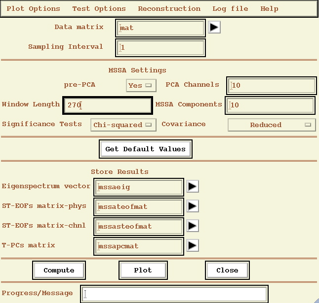 Selecting the `MSSA' option from the Analysis Tools menu on the main panel launches the following window (showing its state after pressing Get Default Values button, and specifying the parameters as described below):