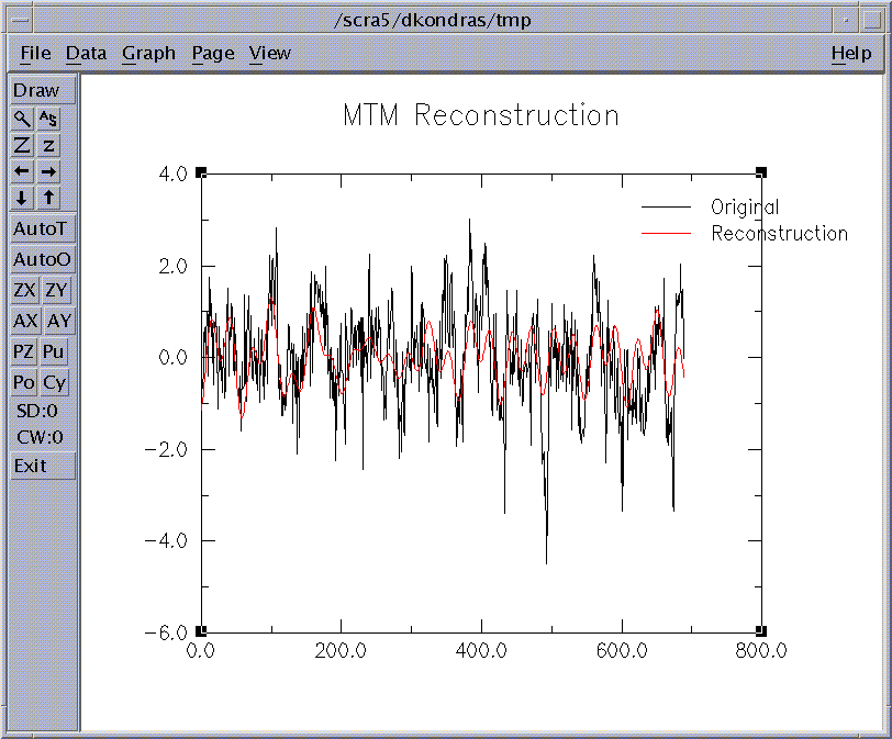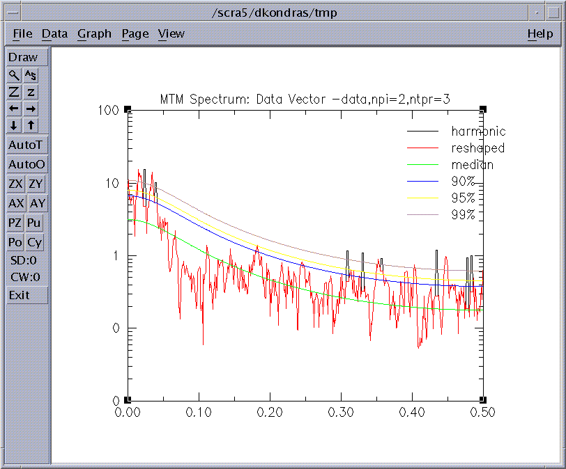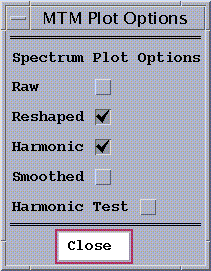 The choice ``harmonic spectrum'' indicates that the estimated harmonic or periodic component of the spectrum should be displayed. If the ``reshaped spectrum'' is also checked, the plot shows the estimated continous spectrum, along with a curve that rises above it to indicate the portion of the spectrum above the continuous background associated with a period signal. The latter component is shown as a narrow spike of breadth equal to the spectral estimation bandwidth.