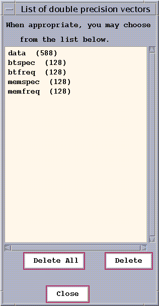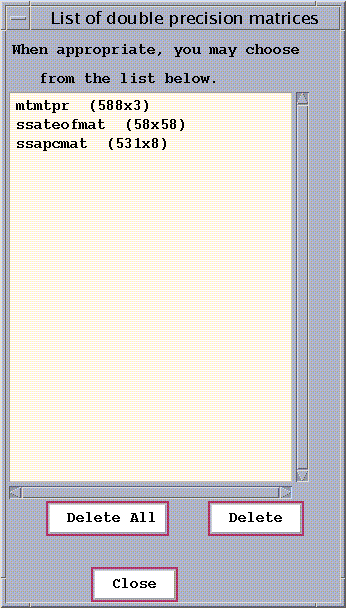 The user has access to vectors and matrices via window lists, which show the names and dimensions (Fig. 1c.), i.e. the number of elements in a vector and number of rows and columns for a matrix. List windows are activated by pressing on the arrow buttons located next to the boxes with the name of the vector or matrix, see Fig. 1.b.